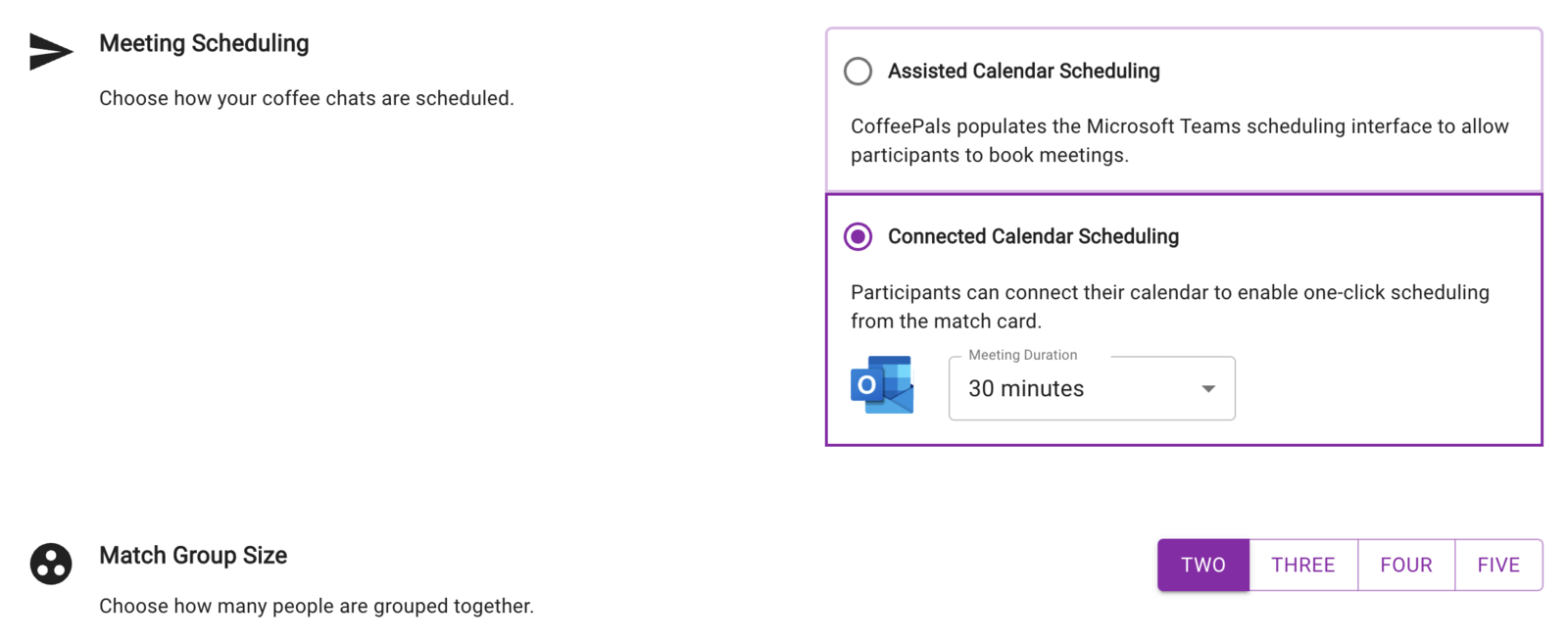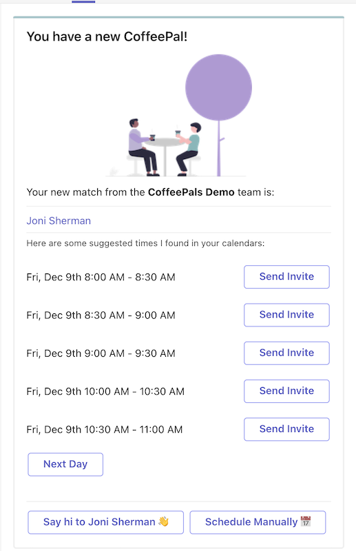 βScheduling your coffee chat just got much easier! When you connect your Outlook calendar, CoffeePals will automatically find times that work for both you and your match based on your availability and working hours. The available times will be displayed directly on the match card, so you can easily choose a time to meet. When you click "Send Invite", a calendar invite will be sent from your account to your match, and the invite will include both users' bios so you can refresh your memory about who you're meeting before the coffee chat. This simplifies the process of scheduling a coffee chat, making it more convenient for users.